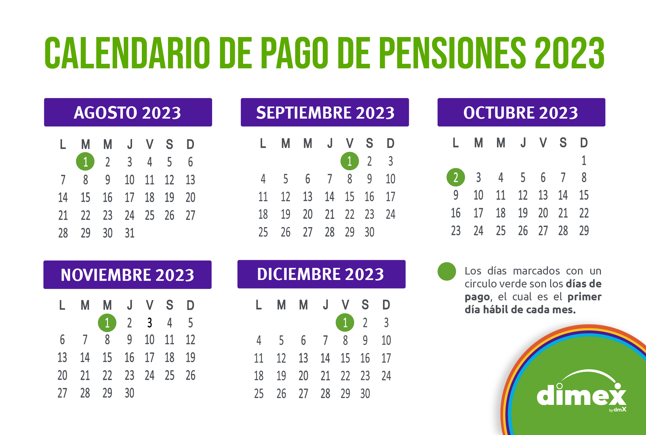 En dimex queremos que estés informado de cuándo recibirás tus pagos de pensión por eso te dejamos a continuación un pequeño calendario con el restante de fechas de pago del 2023: