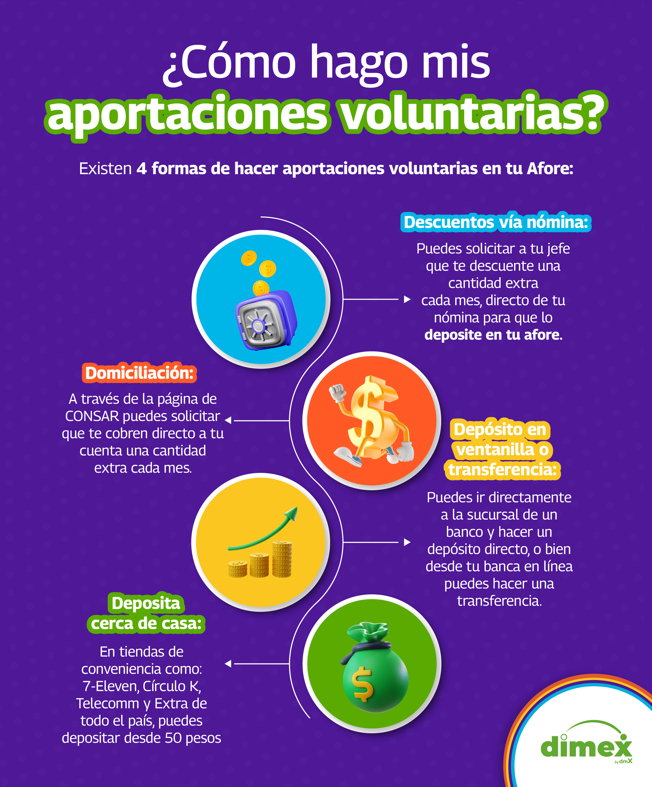 O Aportaciones voluntarias son un complemento a tu ahorro obligatorio y a diferencia de las Contribuciones Obligatorias, en estas tú puedes decidir el monto y la frecuencia con la que harás la aportación.